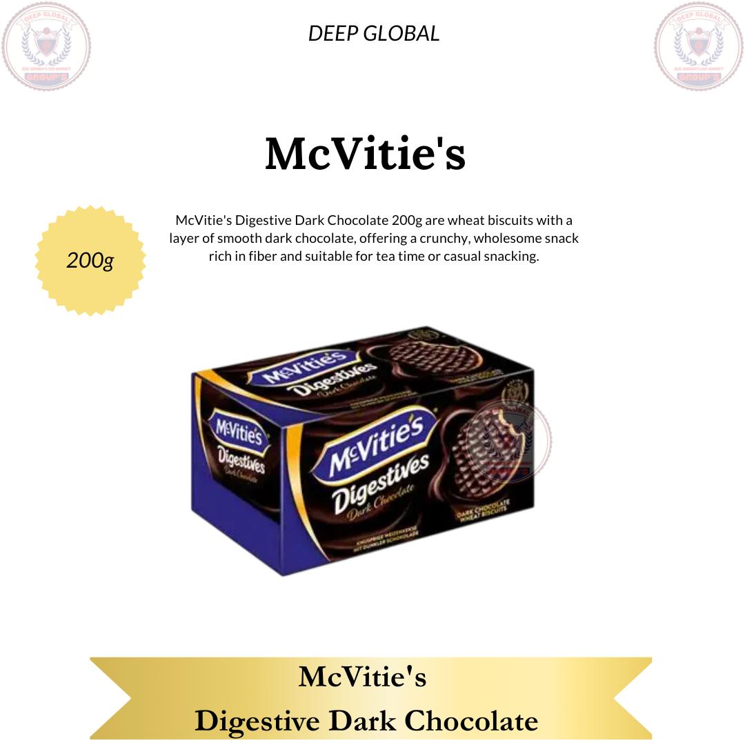 McVitie's Digestive Dark Chocolate 200g are wheat biscuits with a layer of smooth dark chocolate, offering a crunchy, wholesome snack rich in fiber and suitable for tea time or casual snacking.