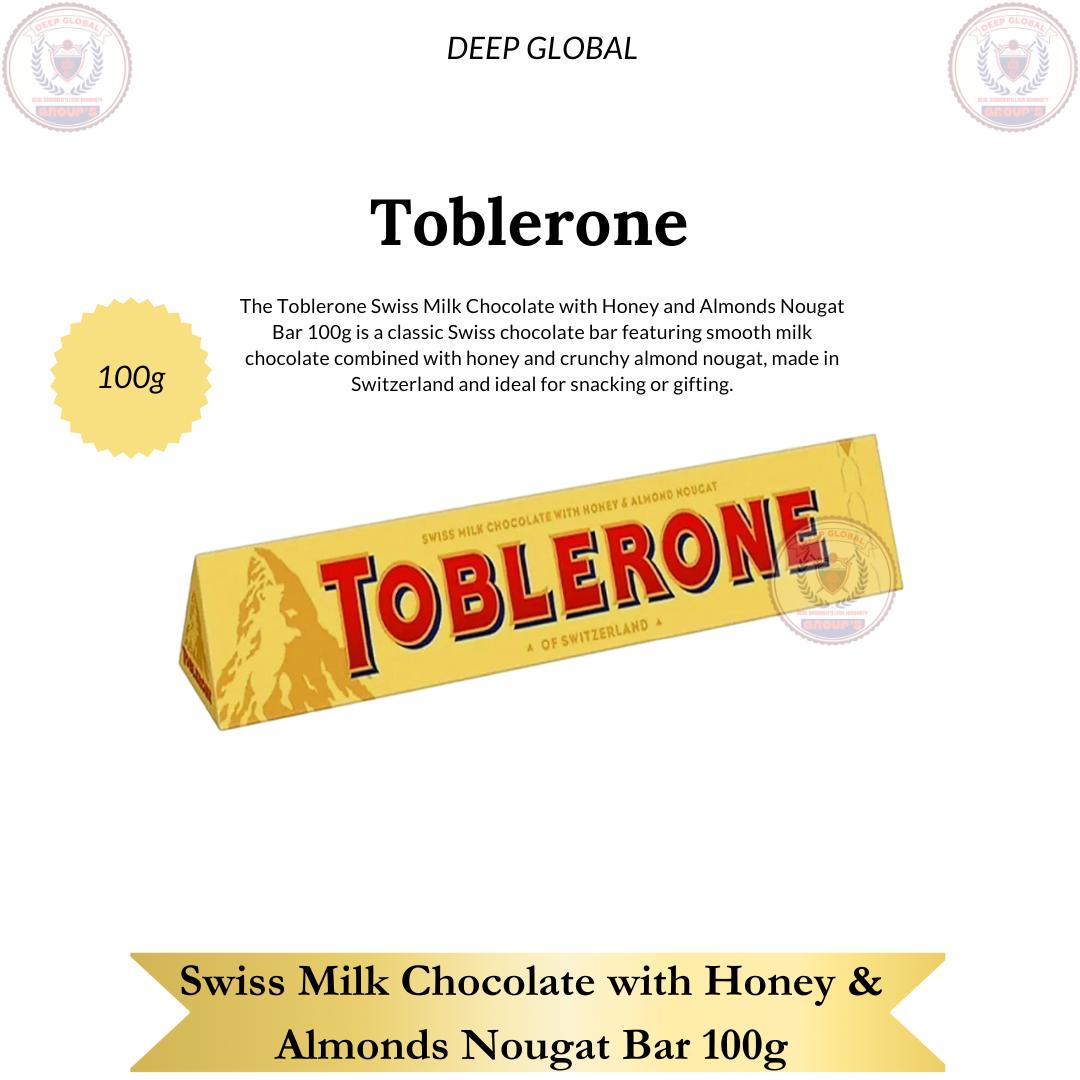The Toblerone Swiss Milk Chocolate with Honey and Almonds Nougat Bar 100g is a classic Swiss chocolate bar featuring smooth milk chocolate combined with honey and crunchy almond nougat, made in Switzerland and ideal for snacking or gifting.
